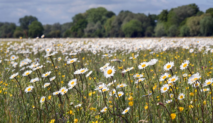 Hunsdon Mead comes to life in April, May and June, and then goes back to a grassy field like any other. Each flower species peaks for a couple of weeks, so it is not possible to see everything in one visit. There is also some variation from one year to the next. The shot at the top of the page was taken early June in 2011, when the meadow was pretty well carpeted. In other years ( my records only go back to 2010 ) the spread of daises was more patchy. The ubiquitous buttercups reliably produce a yellow carpet, before being gradually overpowered by other plants. I think they are most prominent in May. Cow parsley and hogweed grow thick on the margins of the meadow ( which are never cut ) and occasionally on the open ground. In fact the field and the margins are quite distinct environments. Presumably the open field favours plants that can survive cutting ( or grazing ). Plants like willowherb and comfrey find their place in the margins, where they grow tall and vigorously and form large clumps, and leave little space for smaller plants.