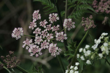 | Hogweed and cow parsley grow mostly on the margins but appear in the meadow as well. Plants of this family ( umbelliferae ), characterized by the parasol shaped 'umbels' of tiny flowers, can be hard to identify precisely. But I think my photo shows a young pinkish-colored umbel of hogweed and some white cow parsley in the background. |