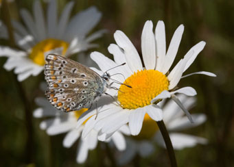 | Oxeye daisies (leucanthemum vulgare) are like giant versions of the familiar lawn daisy. The picture on the right shows the flower and a common blue butterfly. |